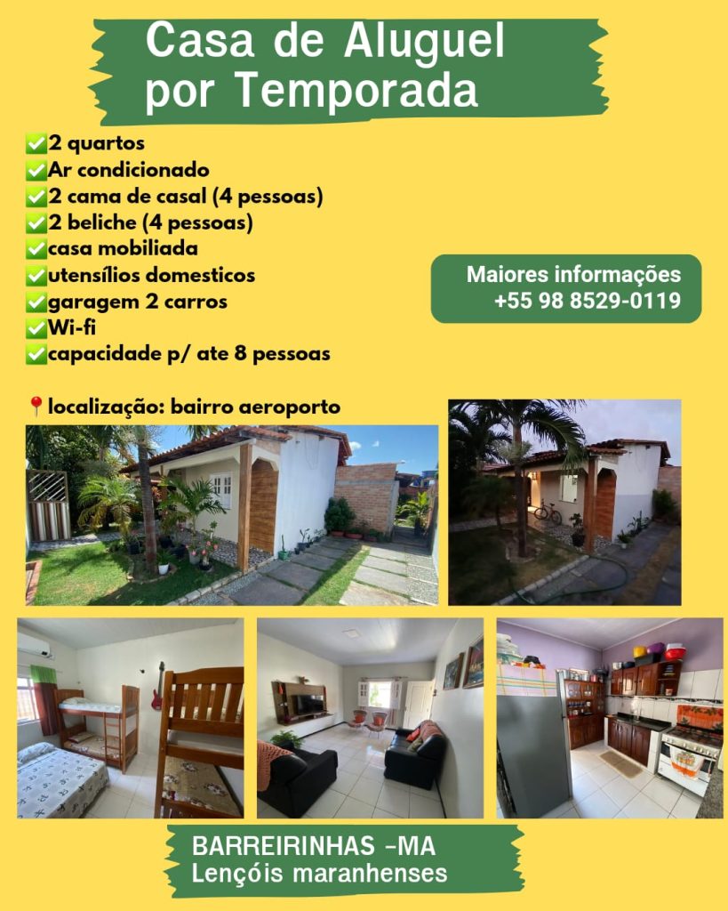 É um grande prazer recebê-lo(a) em nossa casa de temporada em Barreirinhas, Maranhão. Esperamos que sua estadia seja repleta de momentos especiais e conforto. Aqui, você encontrará tudo o que precisa para aproveitar ao máximo o paraíso dos Lençóis Maranhenses.